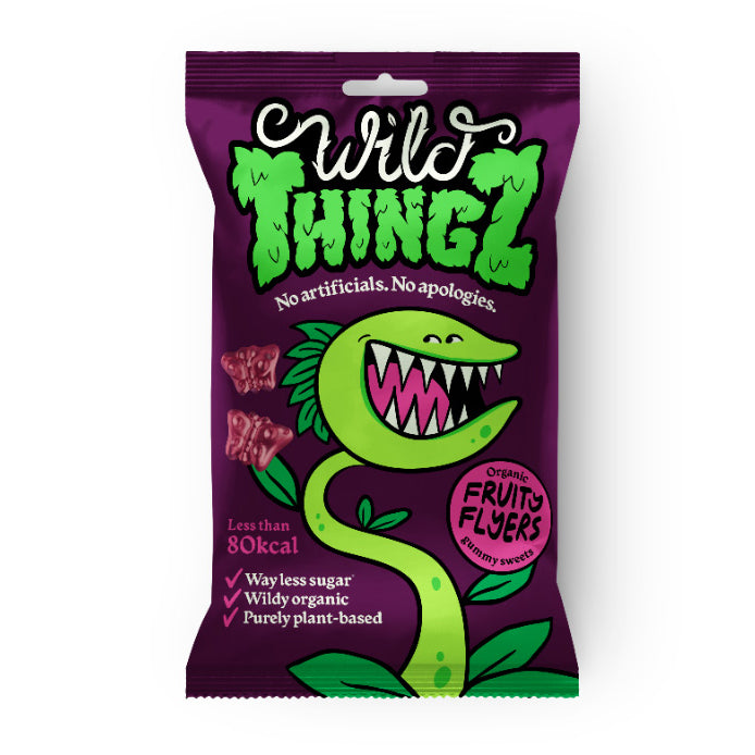 Wild Thingz organic, plant-based gummy sweets. Half the sugar of the big brands. No artificials. No apologies. Our Fruity Flyers contain a cutie fruity mix of Red Apple flavoured Butterflies, Orange flavoured Wasps, Blackcurrant flavoured Ladybirds Cherry and Green Apple flavoured Vee the Venus Fly Trap.No artificial colours, flavours or preservatives. We use pectin’s from fruits to give them their soft jelly consistency (never gelatine).It's wild that sweets are so artificial. We're not gonna stand by sweetly. Less junk. More punk. Welcome to Wild Thingz
